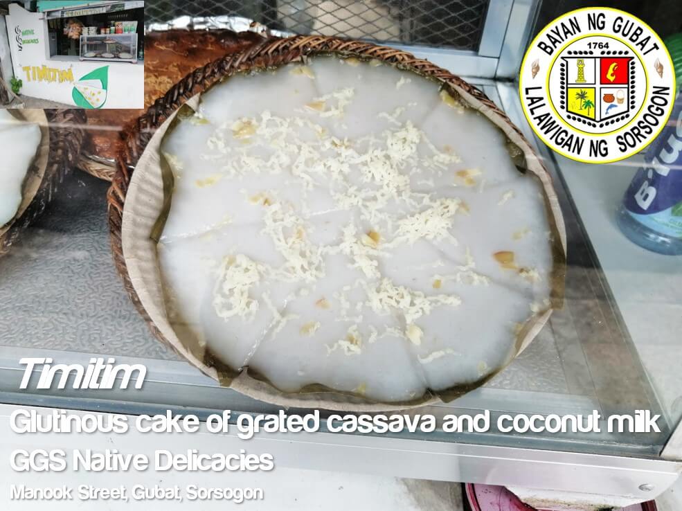Timitim is a local delicacy/pamahawon/merindalan of Gubat, Sorsogon. It is made of cassava (kamoteng kahoy) with coconut milk, topped with pili or corn with Cheese. Some toppings are salted egg and chocolate.