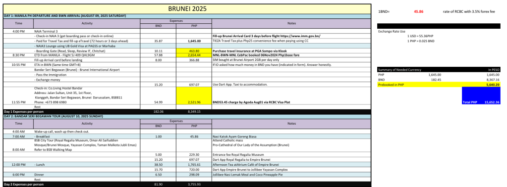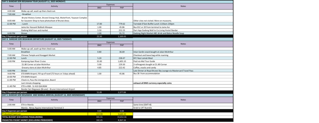 Kindly see my actual expenses below. Note that it’s up to you whether to be splurge or not on activities and foodtrip. I found Brunei (at least within downtown) to be affordable when you dine at local bazaar and restos and buy goods at groceries nearby.